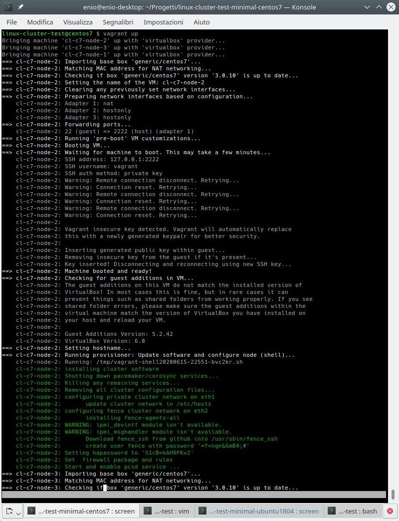 Fatto ciò si può lanciare “vagrant up” in modo da avere un cluster Centos7 su 3 nodi oppure è possibile modificare il Vagrantfile in modo che si possa testare altre possibilità. Inoltre è possibile modificare il Vagrantfile anche successivamente e rilanciare di nuovo “vagrant up” per applicare i cambiamenti.