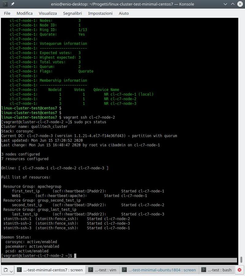 La seconda parte, infine, verrà eseguita solo dal primo nodo, che è l’ultimo in sequenza ad essere inizializzato da Vagrant, tramite lo script “90-single-cluster_configuration.sh” in modo da occuparsi di creare il cluster autorizzando i 3 nodi, quindi di creare le risorse ed i gruppi di risorse ed infine di creare quelle di fence.