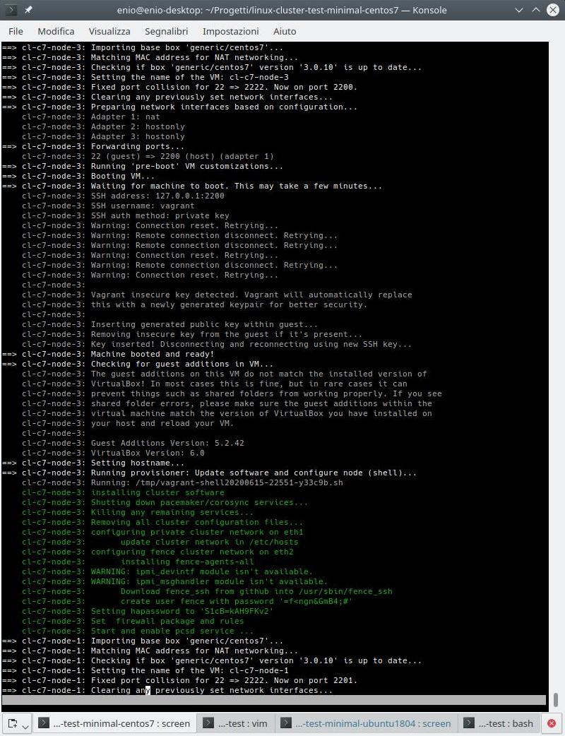 Fatto ciò si può lanciare “vagrant up” in modo da avere un cluster Centos7 su 3 nodi oppure è possibile modificare il Vagrantfile in modo che si possa testare altre possibilità. Inoltre è possibile modificare il Vagrantfile anche successivamente e rilanciare di nuovo “vagrant up” per applicare i cambiamenti.