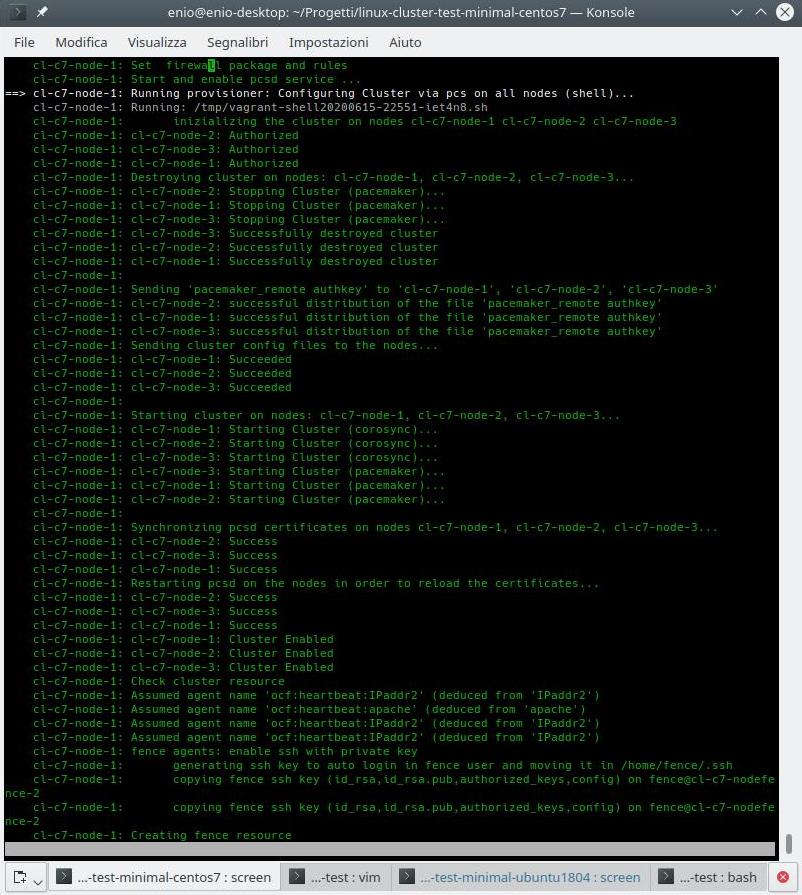 La seconda parte, infine, verrà eseguita solo dal primo nodo, che è l’ultimo in sequenza ad essere inizializzato da Vagrant, tramite lo script “90-single-cluster_configuration.sh” in modo da occuparsi di creare il cluster autorizzando i 3 nodi, quindi di creare le risorse ed i gruppi di risorse ed infine di creare quelle di fence.